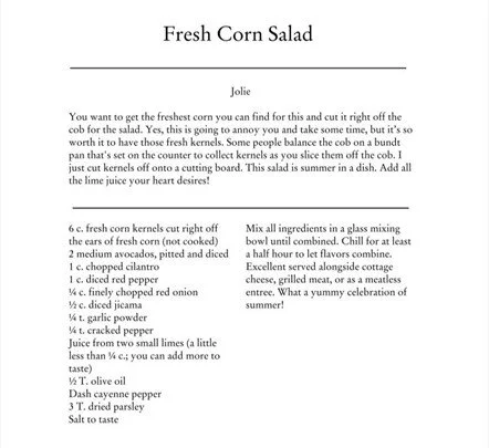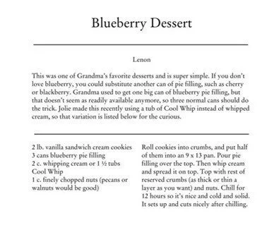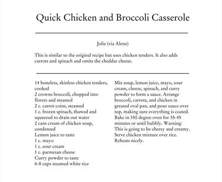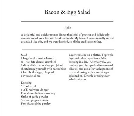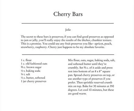 Recipes rotate seasonally, all courtesy of Jolie & her Bezzant Family Cookbook. These are easy peasy because we’re all in a mood after a bad day, yes?